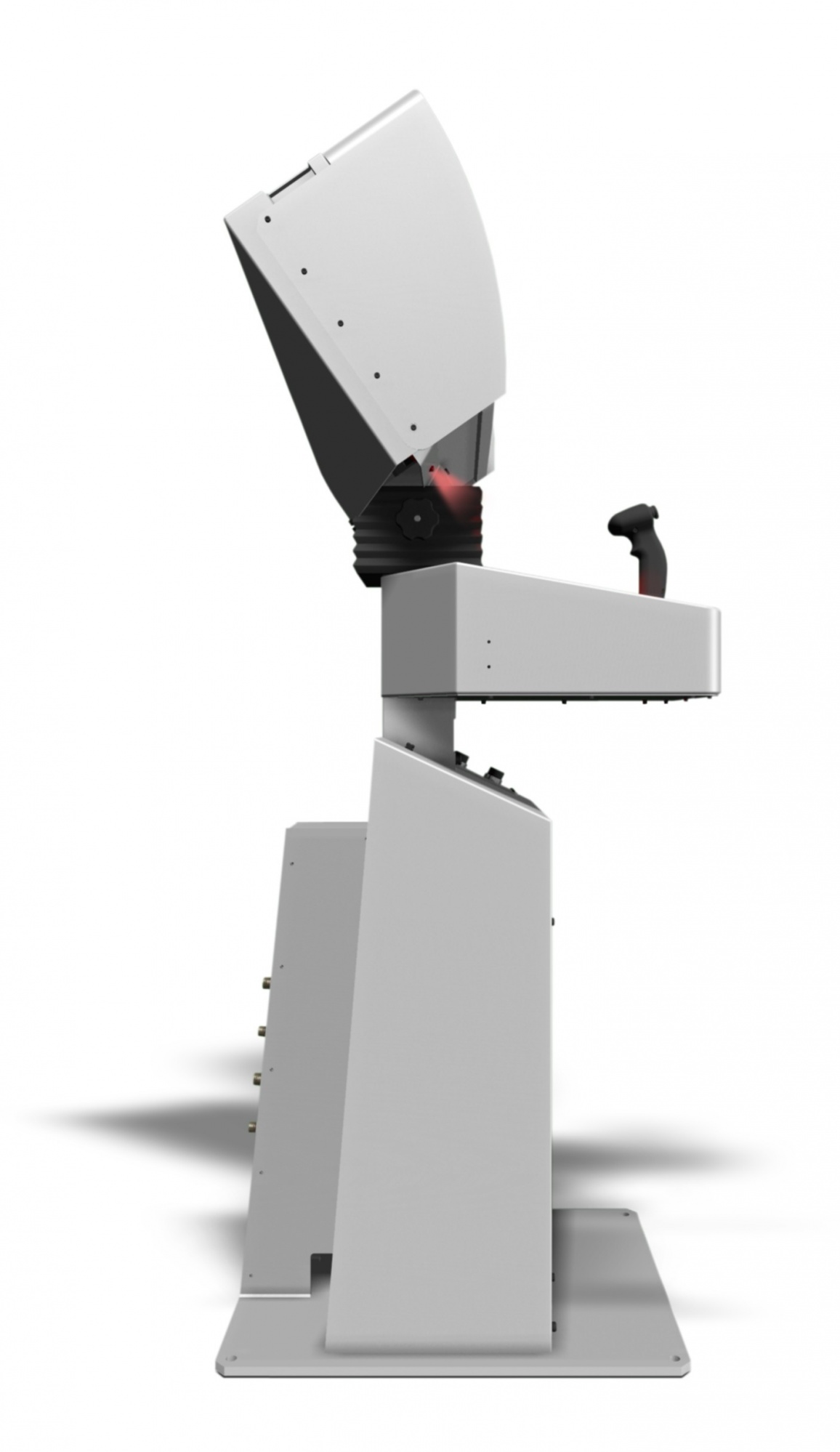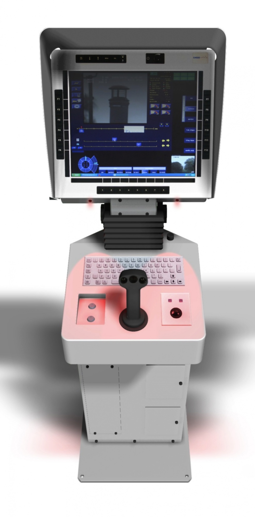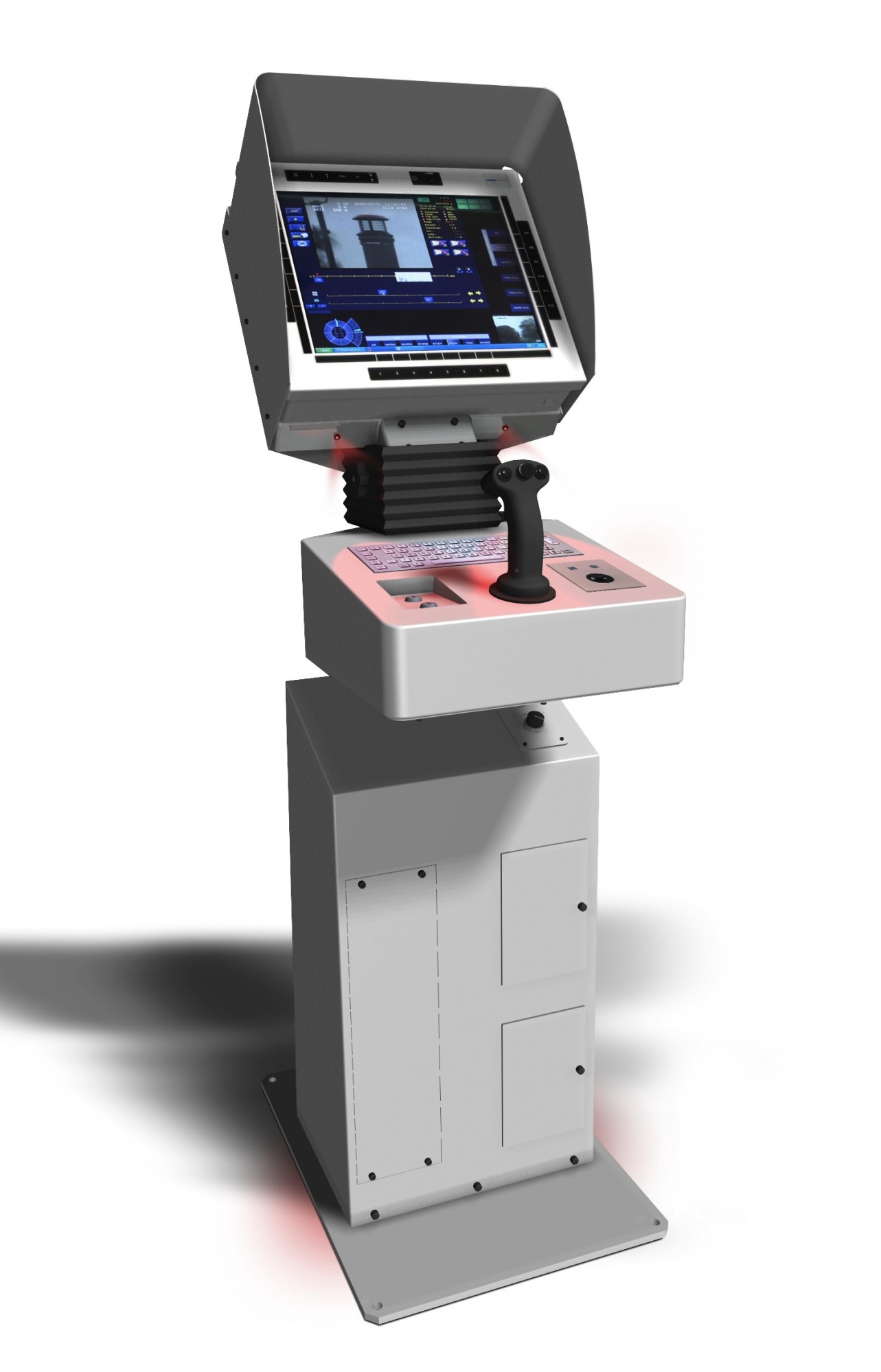 Tel qu'illustré ci-dessus, la console de control navale est muni d'un éclairage variable rouge à l'aide de LED. Cet équipement, qui doit être installé sur le pont, est constitué d'un pédestal central équippé d'un moniteur de 17" et d'une manette de controle.